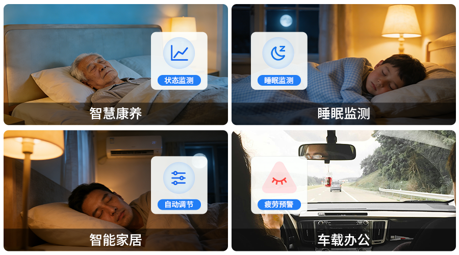 儿童睡眠监测:安装在儿童床附近,实时监测孩子的呼吸、心率及翻身情况。家长通过手机即可查看孩子的睡眠状态,无需频繁开门打扰,让父母更安心。