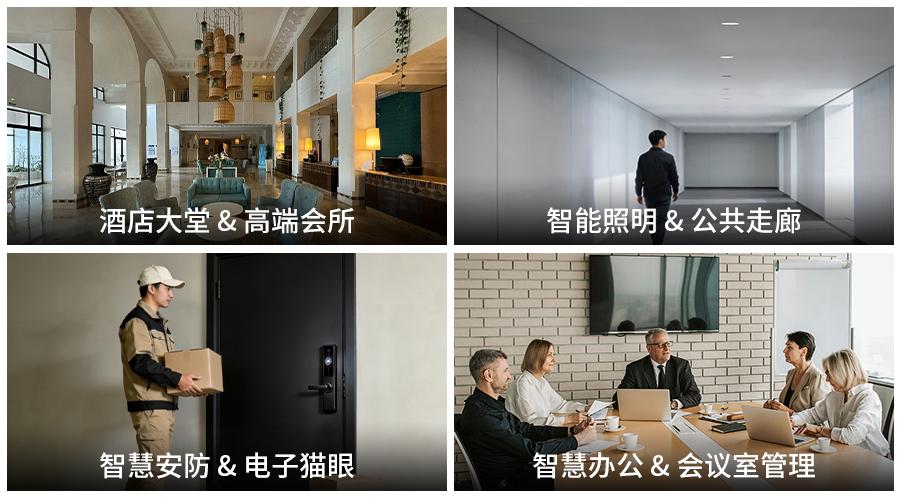 层高超4米,普通传感器无法稳定安装。LD2410-AA支持6米挂顶,一颗覆盖前台、休息区、入口通道。客人静坐休息时,空调灯光保持舒适;无人后自动节能。